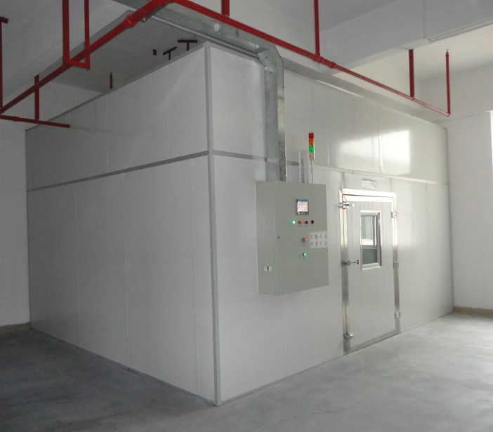 3.4 加熱器放置于老化房頂上循環(huán)風(fēng)道中,四周加防火隔熱材料。采用PID溫度模塊控制,溫度到達(dá)產(chǎn)品所需要溫度后,根據(jù)室內(nèi)溫度波動自動調(diào)節(jié)加熱器功率大小配合保溫庫板的保溫性,使室內(nèi)溫度精確穩(wěn)定在所設(shè)定溫度數(shù)值。 4.空氣調(diào)節(jié)系統(tǒng)